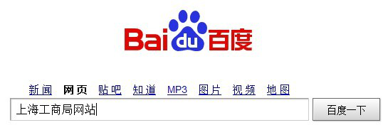 第一步,打開“百度”(www.baidu.com),并在搜索欄內輸入“上海工商局網站”(當然如果您要查詢的是杭州或浙江的公司,那您就要輸入“杭州工商局網站”),如圖: