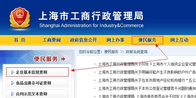 第三步,打開的工商局網站,點擊上端導航欄中“便民服務”。在打開新窗口后,點擊左邊的“企業基本信息查詢”,如圖: