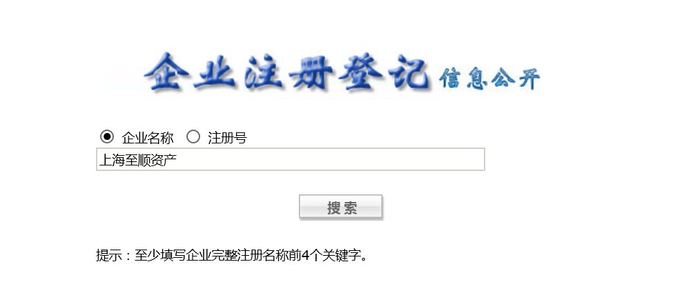 第四步,如下圖,您可以選擇輸入“企業名稱”和“企業注冊號”兩種方式查詢,如果您在不知道對方公司的注冊號的時候,可以直接選擇企業名稱查詢。這里要注意的是輸入的內容必須是企業名稱的前4個字。例如,要查詢“上海至順資產管理有限公司”,則需要輸入“上海至順資產”。當然,至順資產的企業注冊號: 310109000493430,所以您也可以選擇“注冊號”方式查詢。